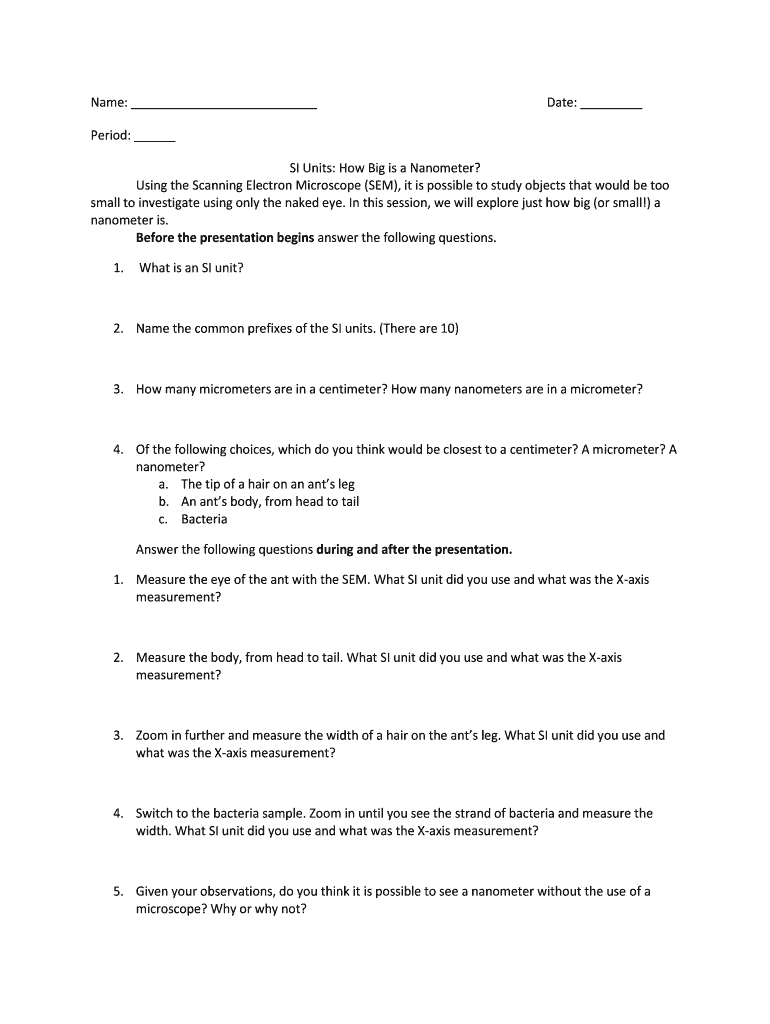 Name: Date: Period: SI Units: How Big is a Nanometer? Using the Scanning Electron Microscope (SEM), it is possible to study objects that would be too small to investigate using only the naked eye.