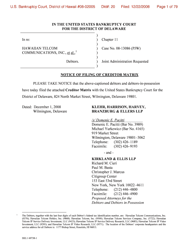 U.S. Bankruptcy Court, District of Hawaii #08-02005 Dot#: 20 Filed: 12/22/2008-Page 1 of 79 IN THE UNITED STATES BANKRUPTCY COURT FOR THE DISTRICT OF DELAWARE In re: HAWAIIAN TEL COM COMMUNICATIONS,