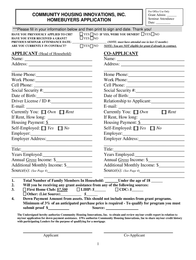 COMMUNITY HOUSING INNOVATIONS, INC. HOMEBUYERS APPLICATION For Office Use Only Grant Admin: Seminar Attendance Date: ***Please fill in your information below and then print to sign and date. Thank