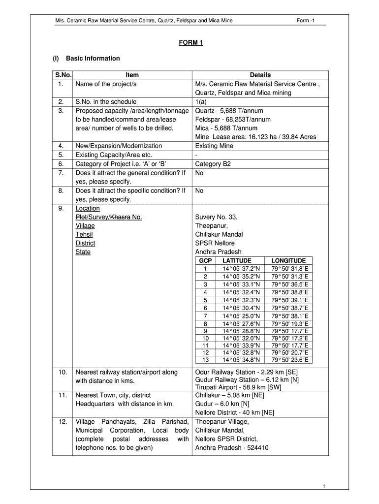 M/s. Ceramic Raw Material Service Center, Quartz, Feldspar and Mica Mine Form 1 FORM 1 (I) Basic Information S. No. Item 1. Name of the project/s 2. 3. 4. 5. 6. 7. 8. 9. Details M/s. Ceramic Raw Material