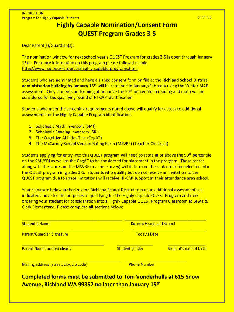 INSTRUCTION Program for Highly Capable Students 2166 F2 Highly Capable Nomination/Consent Form QUEST Program Grades 35 Dear Parent(s)/Guardian(s): The nomination window for next school years QUEST
