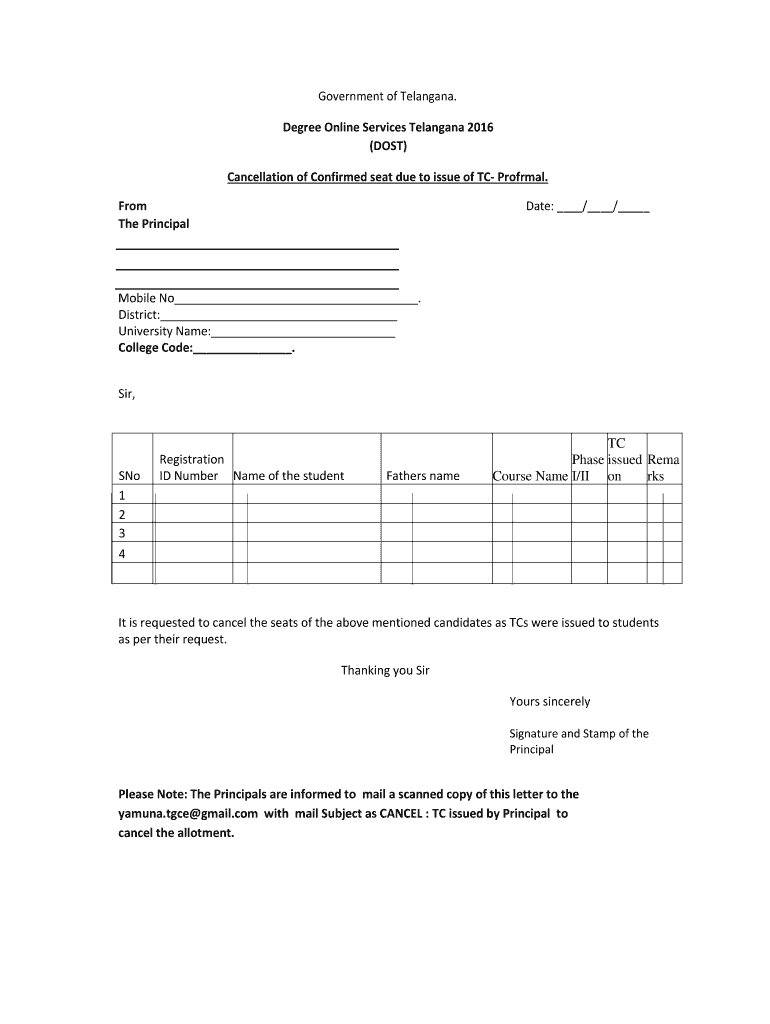 Government of Telangana. Degree Online Services Telangana 2016 (DOST) Cancellation of Confirmed seat due to issue of TC Proximal. From The Principal Date: / / Mobile No. District: University Name: