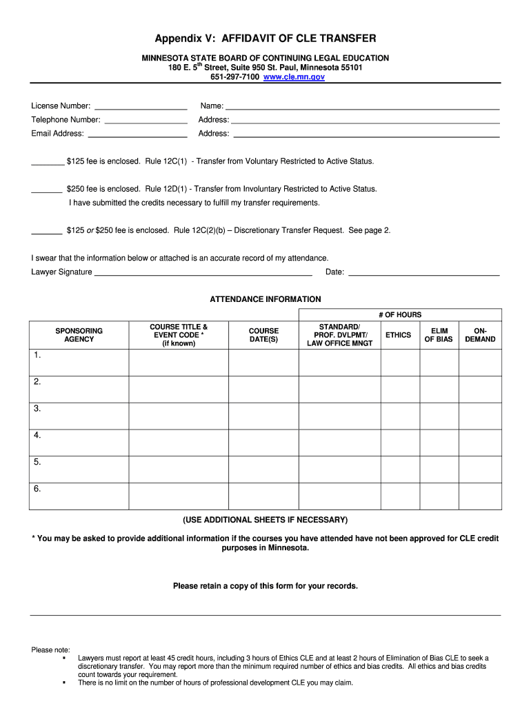 Get the free Appendix V - Transfer Affidavit - cle.mn.gov - cle mn