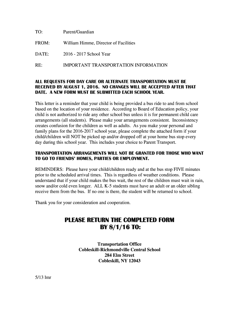 TO: Parent/Guardian FROM: William Gimme, Director of Facilities DATE: 2016 2017 School Year RE: IMPORTANT TRANSPORTATION INFORMATION ALL REQUESTS FOR DAY CARE OR ALTERNATE TRANSPORTATION MUST BE RECEIVED