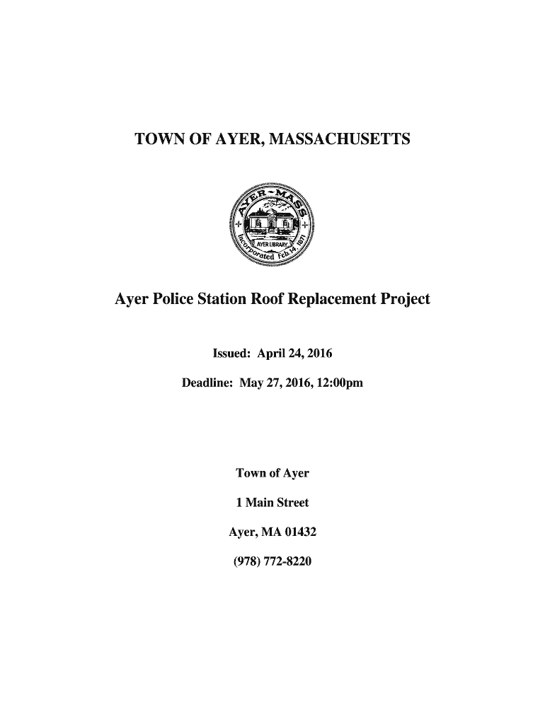 TOWN OF LAYER, MASSACHUSETTS Layer Police Station Roof Replacement Project Issued: April 24, 2016, Deadline: May 27, 2016, 12:00pm Town of Layer 1 Main Street Layer, MA 01432 (978) 7728220 TABLE OF