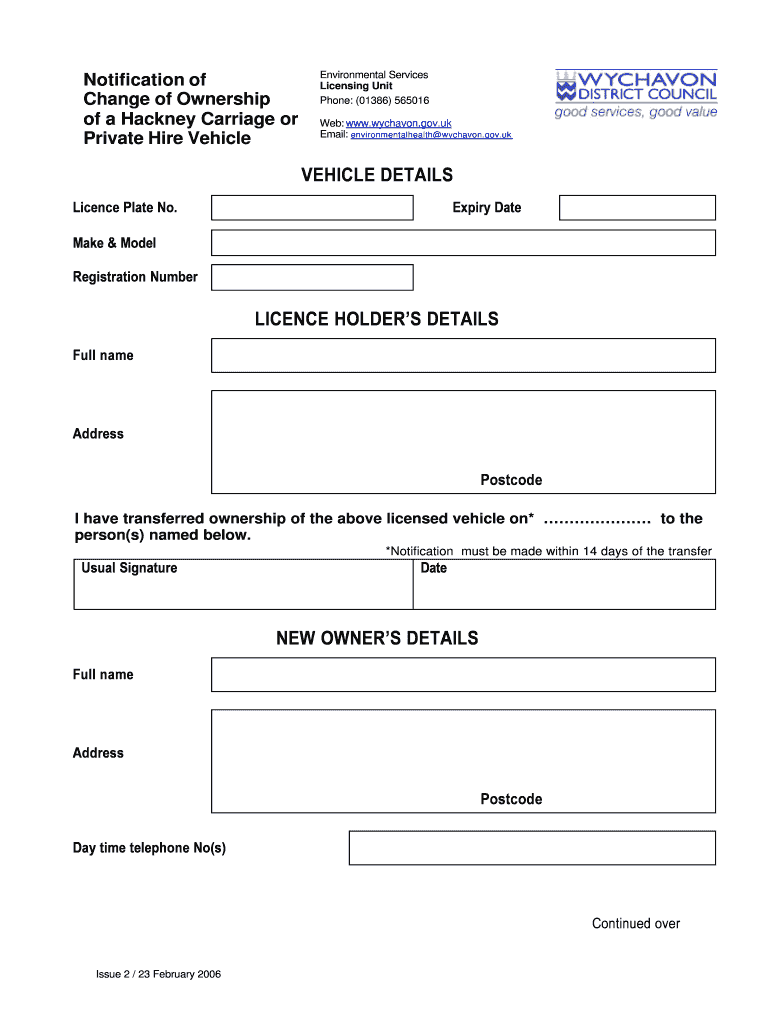 Notification of Change of Ownership of a Hackney Carriage or Private Hire Vehicle Environmental Services Licensing Unit Phone: (01386) 565016 Web: www.wychavon.gov.uk Email: environmental health Wychavon.gov.UK
