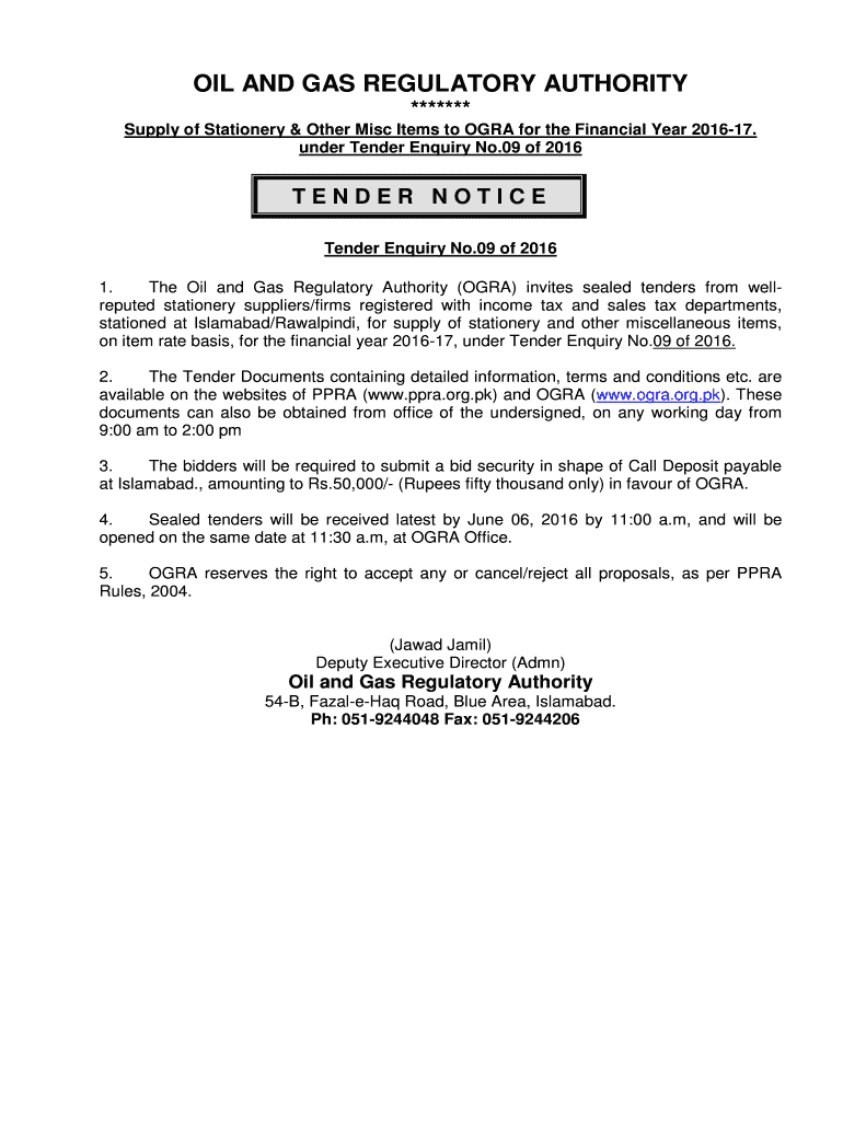 OIL AND GAS REGULATORY AUTHORITY ******* Supply of Stationery & Other Misc Items to AGRA for the Financial Year 201617. Under Tender Inquiry No.09 of 2016 TENDER NOTICE Tender Inquiry No.09 of 2016
