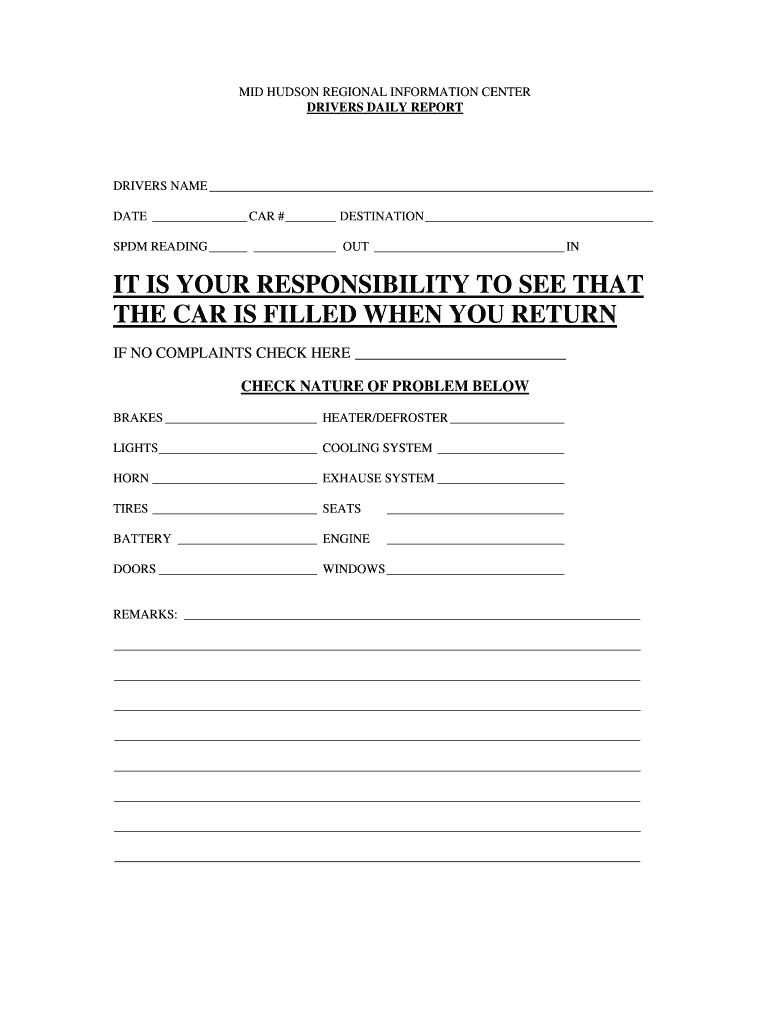 MID HUDSON REGIONAL INFORMATION CENTER DRIVERS DAILY REPORT DRIVERS NAME DATE CAR # DESTINATION SPAM READING OUT IN IT IS YOUR RESPONSIBILITY TO SEE THAT THE CAR IS FILLED WHEN YOU RETURN IF NO COMPLAINTS