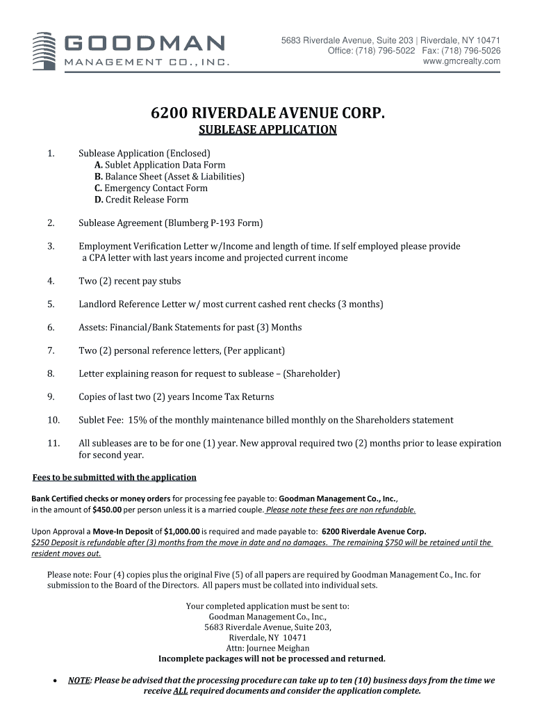 5683 Riverdale Avenue, Suite 203 Riverdale, NY 10471 Office: (718) 7965022 Fax: (718) 7965026 www.gmcrealty.com 6200 RIVERDALE AVENUE CORP. 1. 2. 3. 4. 5. 6. 7. 8. 9. 10. 11. SUBLEASE APPLICATION