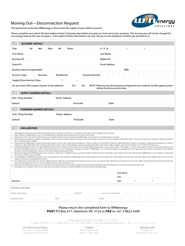 Moving Disconnection Request This agreement authorizes WIN energy to disconnect the supply of your utilities account. Please complete and submit the form below at least 3 business days before you