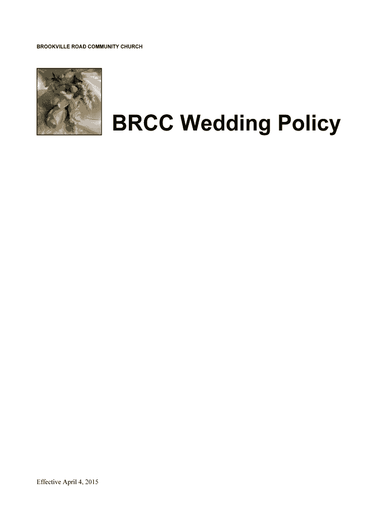 BROOKVILLEROADCOMMUNITYCHURCH BRCCWeddingPolicy EffectiveApril4,2015 Brookville Road Community Church 7480WUS52 New Palestine,IN46163 317.861.3880 Email:weddings Bicolline.net To the Bride and Groom: