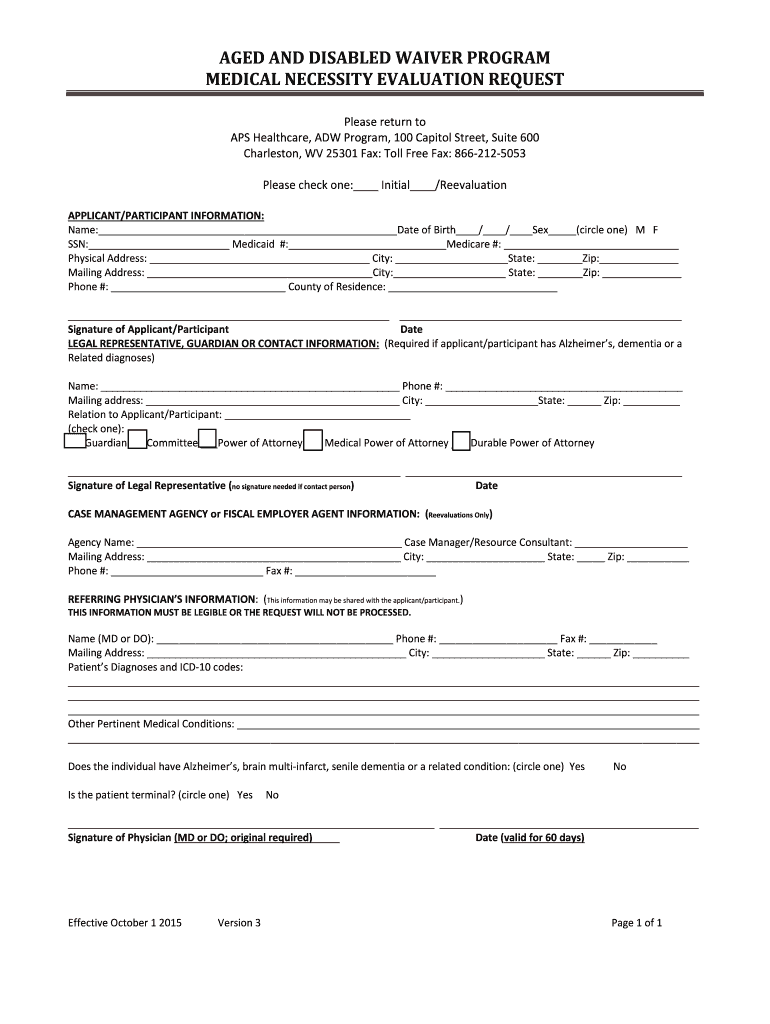 AGED AND DISABLED WAIVER PROGRAM MEDICAL NECESSITY EVALUATION REQUEST Please return to. APS Healthcare, ADD Program, 100 Capitol Street, Suite 600