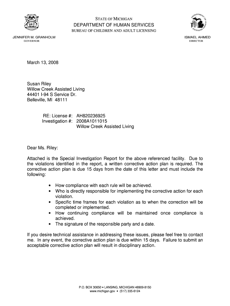 STATE OF MICHIGAN DEPARTMENT OF HUMAN SERVICES BUREAU OF CHILDREN AND ADULT LICENSING JENNIFER M. GRANOLA ISMAEL AHMED GOVERNOR DIRECTOR March 13, 2008, Susan Riley Willow Creek Assisted Living 44401