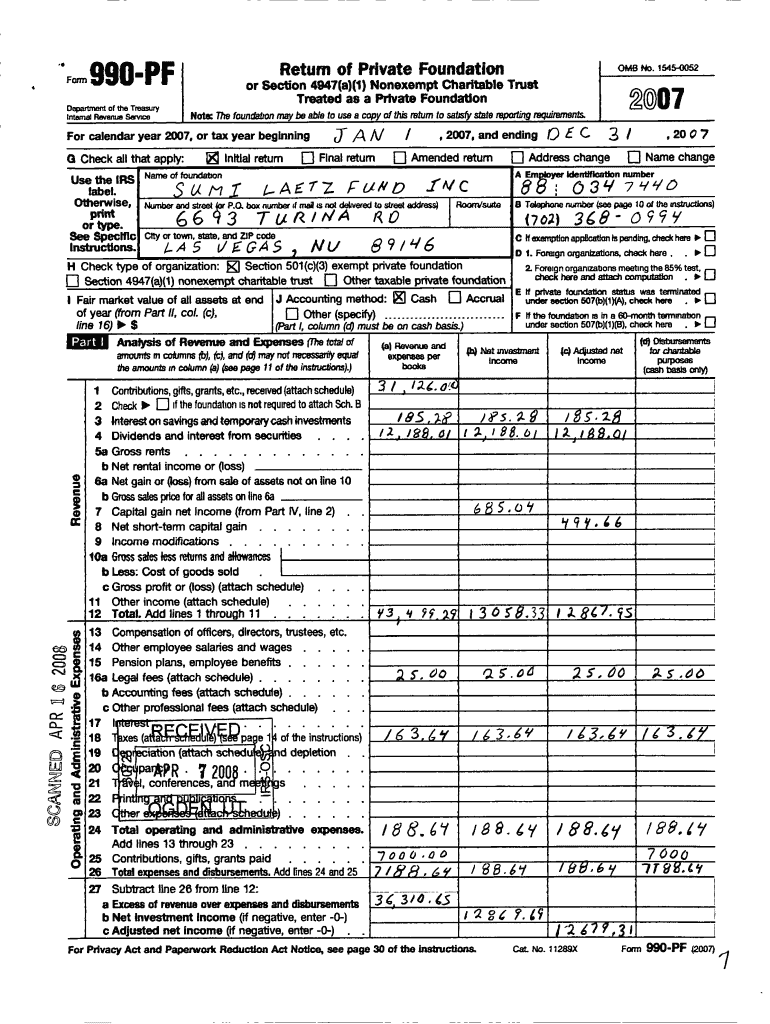 Return of Private Foundation OEPA RO, em of the tram, Ry Internal Revenue semé B No. 154 500552 or Section 4947(a)(1) Nonexempt Charitable Trust Treated as a Private Foundation non DC 2007 Note: