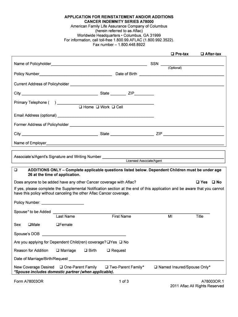 APPLICATION FOR REINSTATEMENT AND/OR ADDITIONS CANCER INDEMNITY SERIES A78000 American Family Life Assurance Company of Columbus (herein referred to as Flag) Worldwide Headquarters Columbus, GA 31999