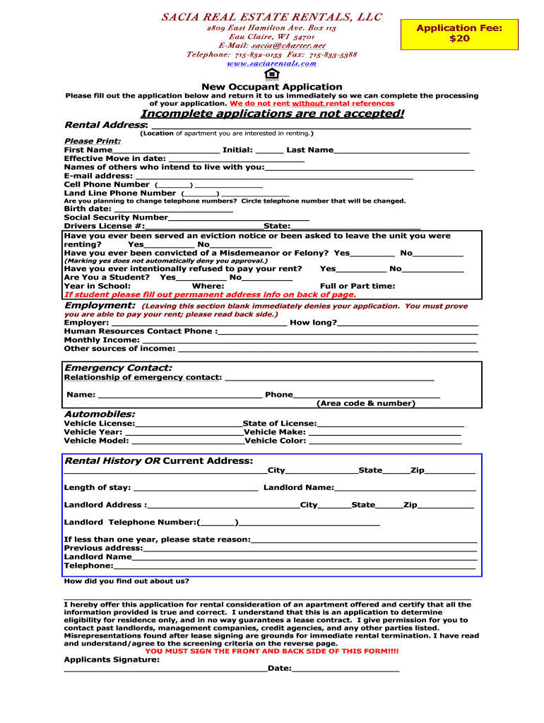 SACRA REAL ESTATE RENTALS, LLC 2809 East Hamilton Ave. Box 113 Eau Claire, WI 54701 Email: sacra charter.net Telephone: 7158320133 Fax: 7158335388 www.saciarentals.com Application Fee: $20 New Occupant