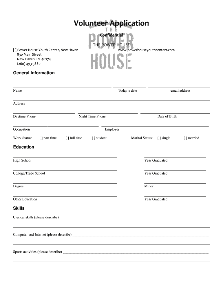 Volunteer Application Confidential THE POWER HOUSE Youth Center, New Haven 830 Main Street New Haven, IN 46774 (260) 4933880 www.powerhouseyouthcenters.com General Information Name Today's date email