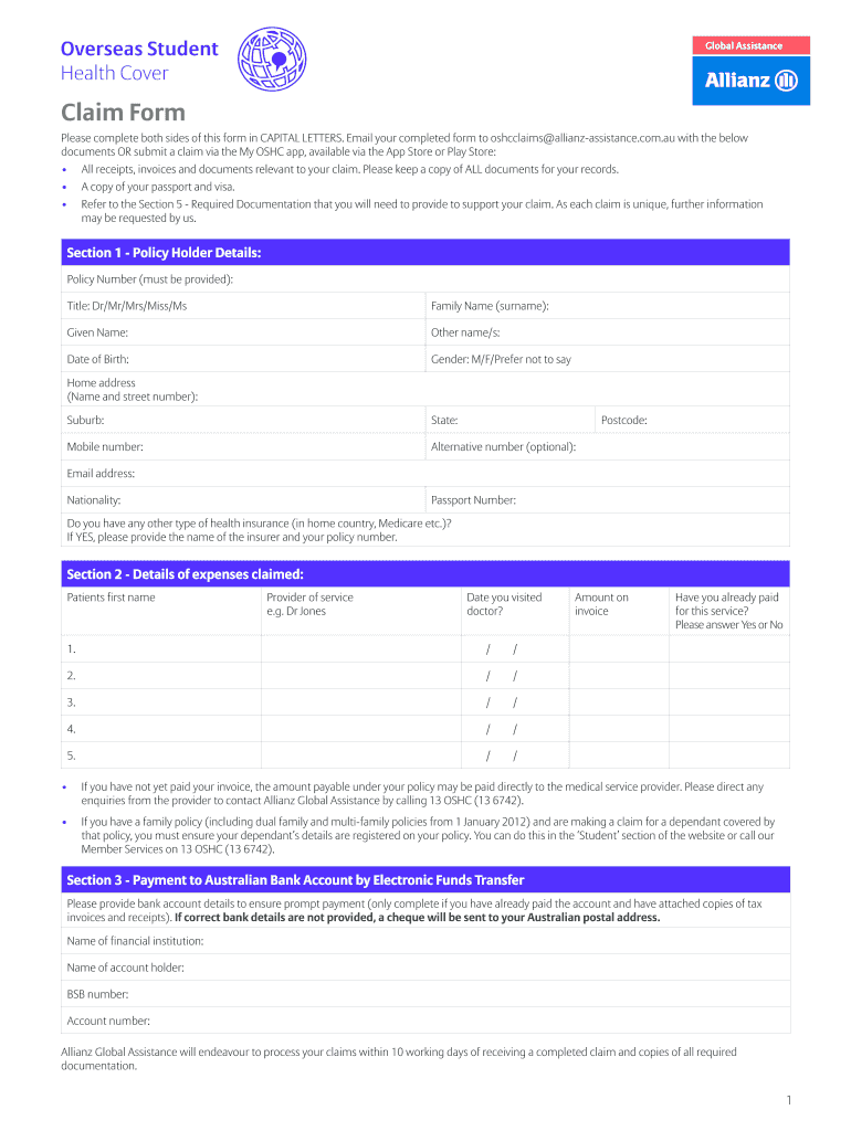 Claim Form Please complete both sides of this form in CAPITAL LETTERS. Email your completed form to acclaims×allianz-assistance.com.AU with the below.