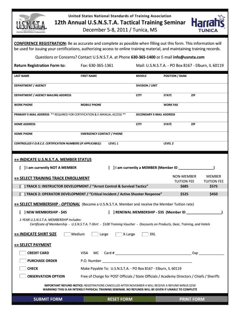 United States National Standards of Training Association 12th Annual U.S.N.S.T.A. Tactical Training Seminar December 5-8, 2011 / Tunica, MS CONFERENCE REGISTRATION ...