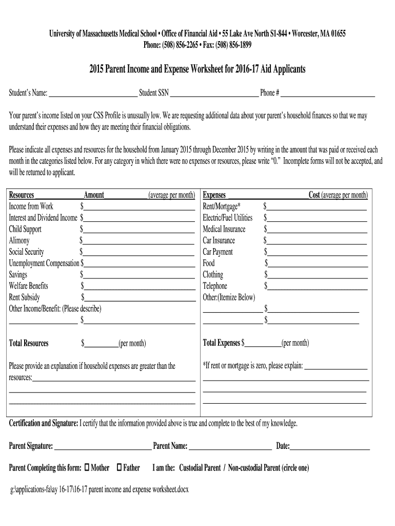 Get the free 2015 Parent Income and Expense Worksheet for 2016-17 Aid ... - umassmed