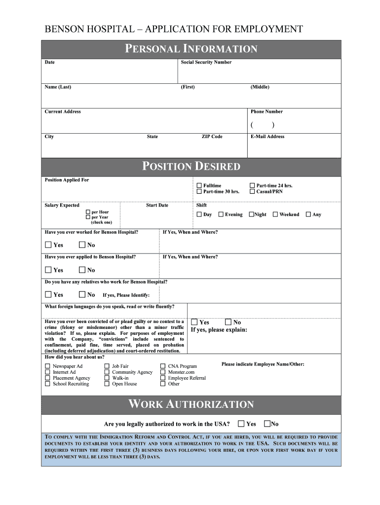 Get the free New Benson Hospital Job Application.doc - bensonhospital