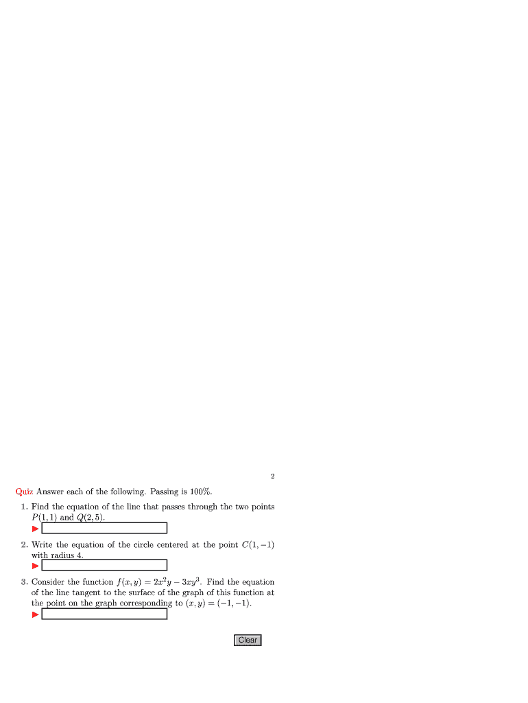 2 Quiz Answer each of the following. Passing is 100×. 1. Find the equation of the line that passes through the two points P(1,1) and Q(2,5). 2. Write the equation of ...