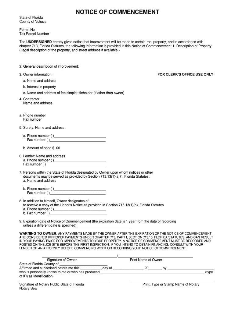 NOTICE OF COMMENCEMENT State of Florida County of Völuspá Permit No Tax Parcel Number The UNDERSIGNED hereby gives notice that improvement will be made to certain real property, and in accordance