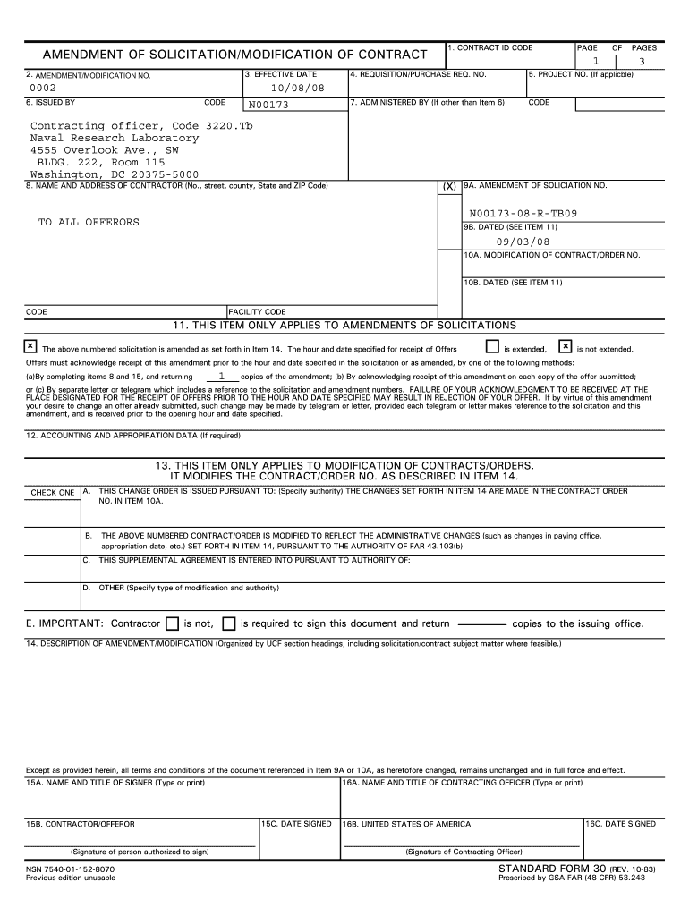 AMENDMENT OF SOLICITATION/MODIFICATION OF CONTRACT 2. AMENDMENT/MODIFICATION NO. AMENDMENT/MODIFICATION NO. 3. EFFECTIVE DATE 0002 6. ISSUED BY 10/08/08 N00173 CODE 1. CONTRACT ID CODE PAGE OF PAGES