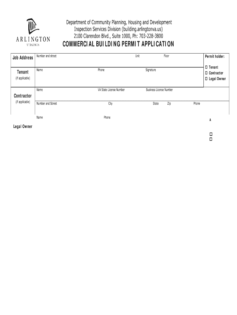 Department of Community Planning, Housing and Development Inspection Services Division (building. Arlington.us) 2100 Clarendon Blvd., Suite 1000, pH: 703-228-3800 COMMERCIAL BUILDING PERMIT APPLICATION