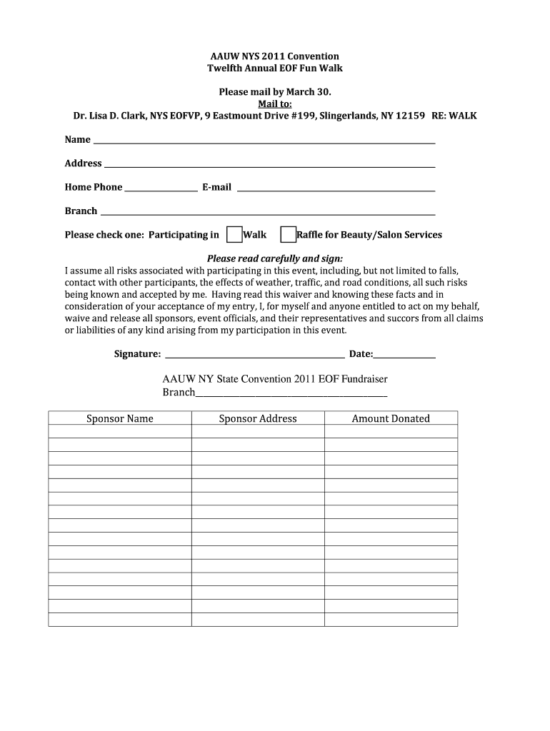AAU NYS 2011 Convention. Twelfth Annual EOF Fun Walk. Please mail by March 30. Mail to: Dr. Lisa D. Clark, NYS EOF VP, 9 East mount Drive #199, Hinterlands, NY 12159 ...