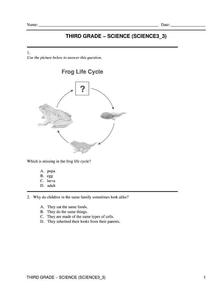 Name: Date: THIRD GRADE SCIENCE (SCIENCE3 3) 1. Use the picture below to answer this question. Which is missing in the frog life cycle? A. B. C. D. pupa egg larva adult 2. Why do children in the same