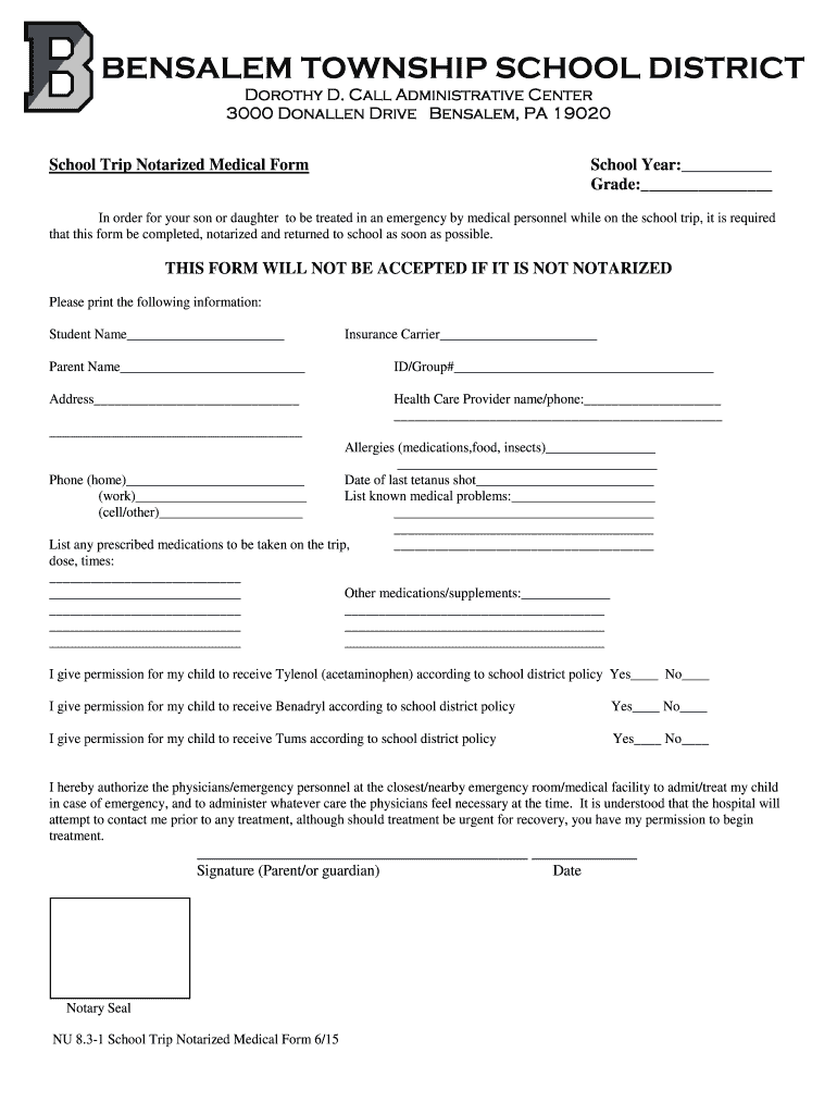 BENSALEM TOWNSHIP SCHOOL DISTRICT Dorothy D. Call Administrative Center 3000 Downfallen Drive Bensalem, PA 19020 School Trip Notarized Medical Form School Year: Grade: In order for your son or daughter