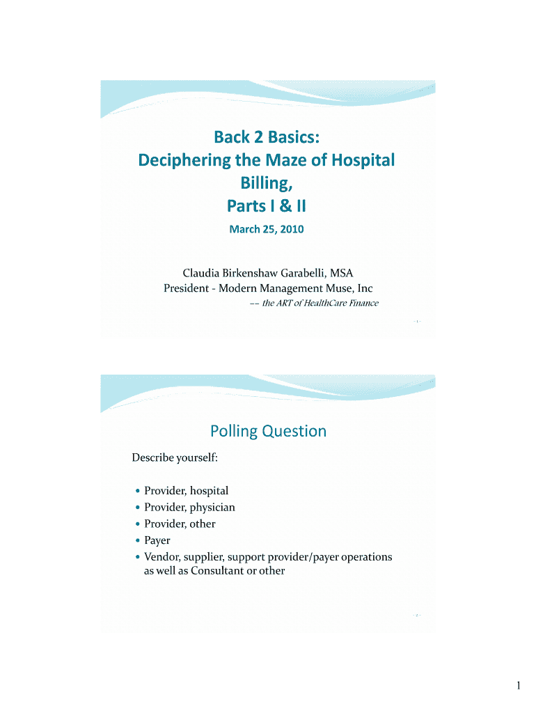 Back2Basics: DecipheringtheMazeofHospital Billing, Parasitic March25,2010 ClaudiaBirkenshawGarabelli, MSA President ModernManagementMuse, Inc the ART of Healthcare Finance 1 PollingQuestion Describe