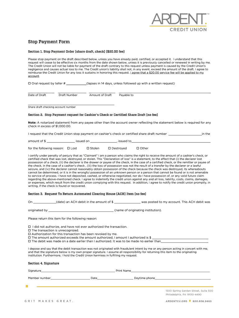 Get the free Stop Payment Form - Ardent Credit Union - ardentcu