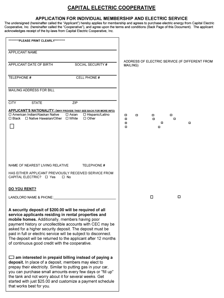 CAPITAL ELECTRIC COOPERATIVE APPLICATION FOR INDIVIDUAL MEMBERSHIP AND ELECTRIC SERVICE The undersigned (hereinafter called the Applicant) hereby applies for ...