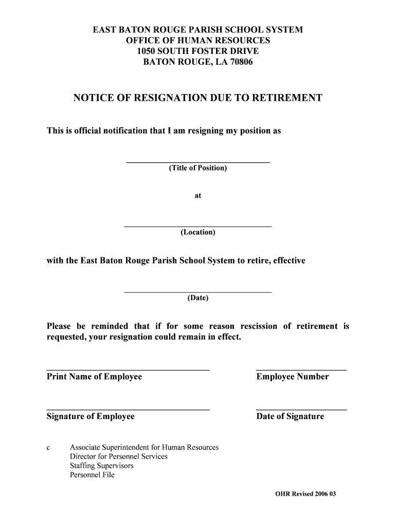 East Baton Rouge Parish school system office of human resources 1050 south foster drive Baton Rouge, la 70806 notice of resignation due to retirement