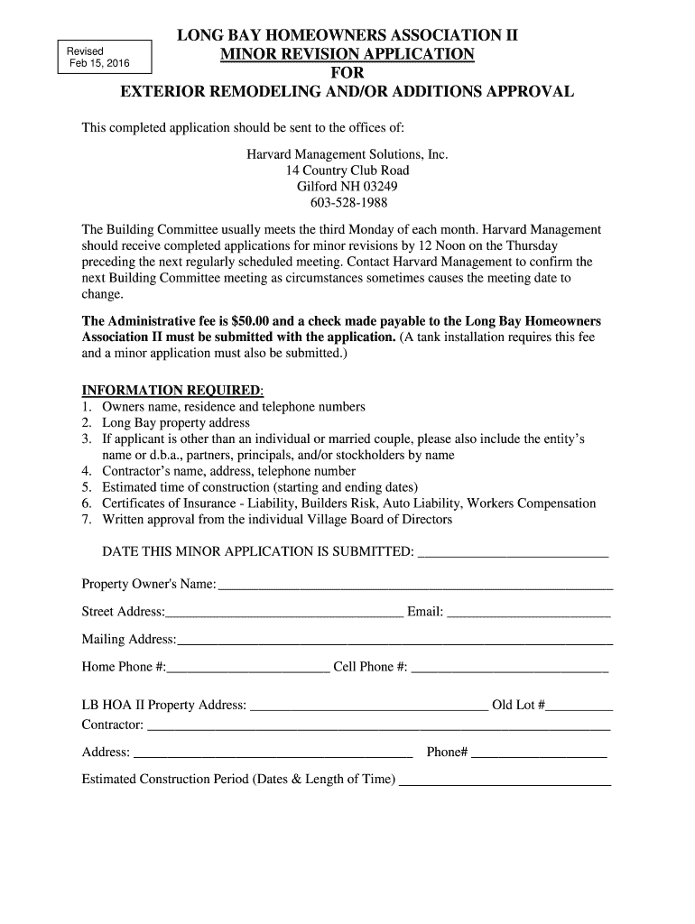LONG BAY HOMEOWNERS ASSOCIATION II MINOR REVISION APPLICATION FOR EXTERIOR REMODELING AND/OR ADDITIONS APPROVAL Revised Feb 15, 2016 This completed application should be sent to the offices of: Harvard