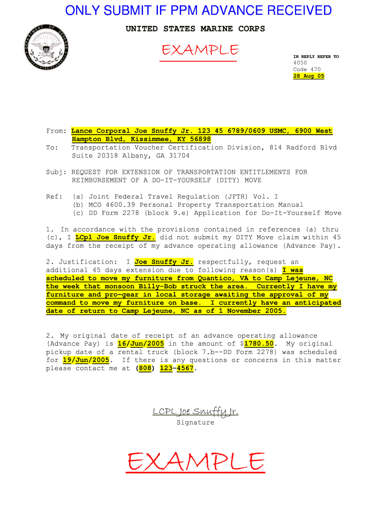 ONLY SUBMIT IF PPM ADVANCE RECEIVED UNITED STATES MARINE CORPS EXAMPLE IN REPLY REFER TO 4050 Code 470 28 Aug 05 From: Lance Corporal Joe Snuff Jr. 123 45 6789/0609 USMC, 6900 West Hampton Blvd, Kissimmee,