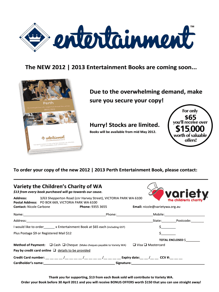 The NEW 2012 2013 Entertainment Books are coming soon... Due to the overwhelming demand, make sure you secure your copy! Hurry! Stocks are limited. Books will be available from mid-May 2012. To order