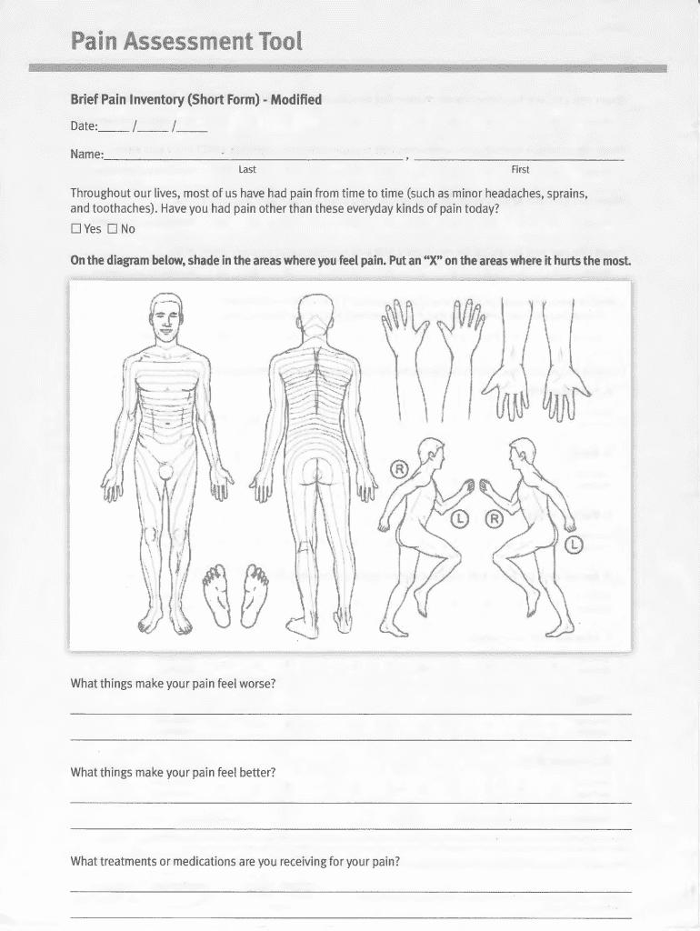 Pain Assessment Tool Brief Pain Inventory Short Form) Modified Date: / / Name: Last First Throughout our lives, most of us have had pain from time to time (such as minor headaches, sprains, and toothaches).