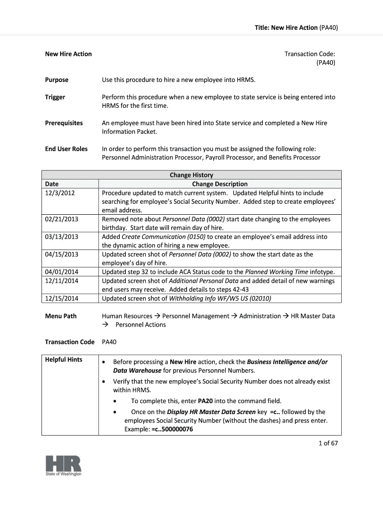 Title: New Hire Action (PA40) New Hire Action Transaction Code: (PA40) Purpose Use this procedure to hire a new employee into HRMS. Trigger Perform this procedure when a new employee to state service