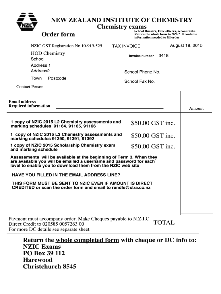 NEW ZEALAND INSTITUTE OF CHEMISTRY exams School Bursars, Exec offers, accountants. Return the whole form to NBIC. It contains Order form information needed to ll order. NBIC GST Registration No.10919525