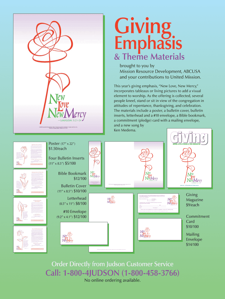 Giving Emphasis & Theme Materials brought to you by Mission Resource Development, ABC USA and your contributions to United Mission. This year's giving emphasis, New Love, New Mercy, incorporates tableaux