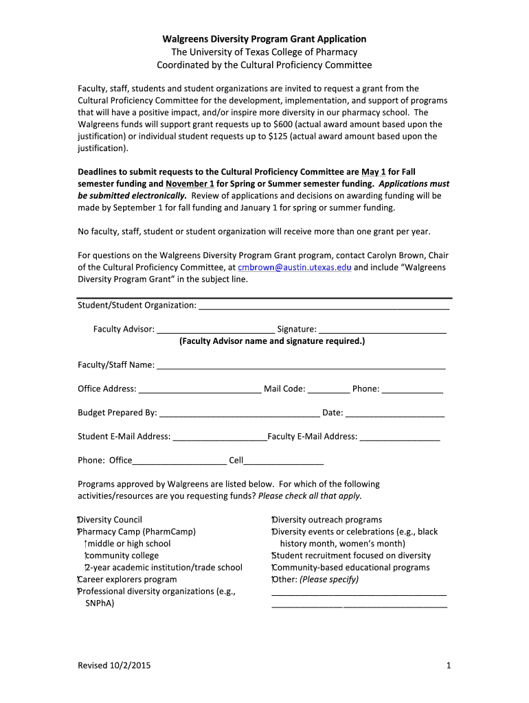 Walgreens Diversity Program Grant Application The University of Texas College of Pharmacy Coordinated by the Cultural Proficiency Committee Faculty, staff, students and student organizations are invited
