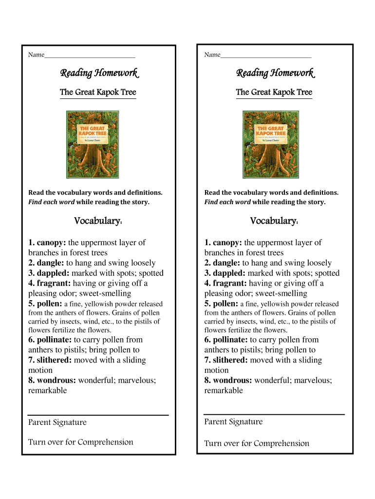 Name Reading Homework The Great Kapok Tree The Great Kapok Tree Read the vocabulary words and definitions. Find each word while reading the story. Read the vocabulary words and definitions. Find each