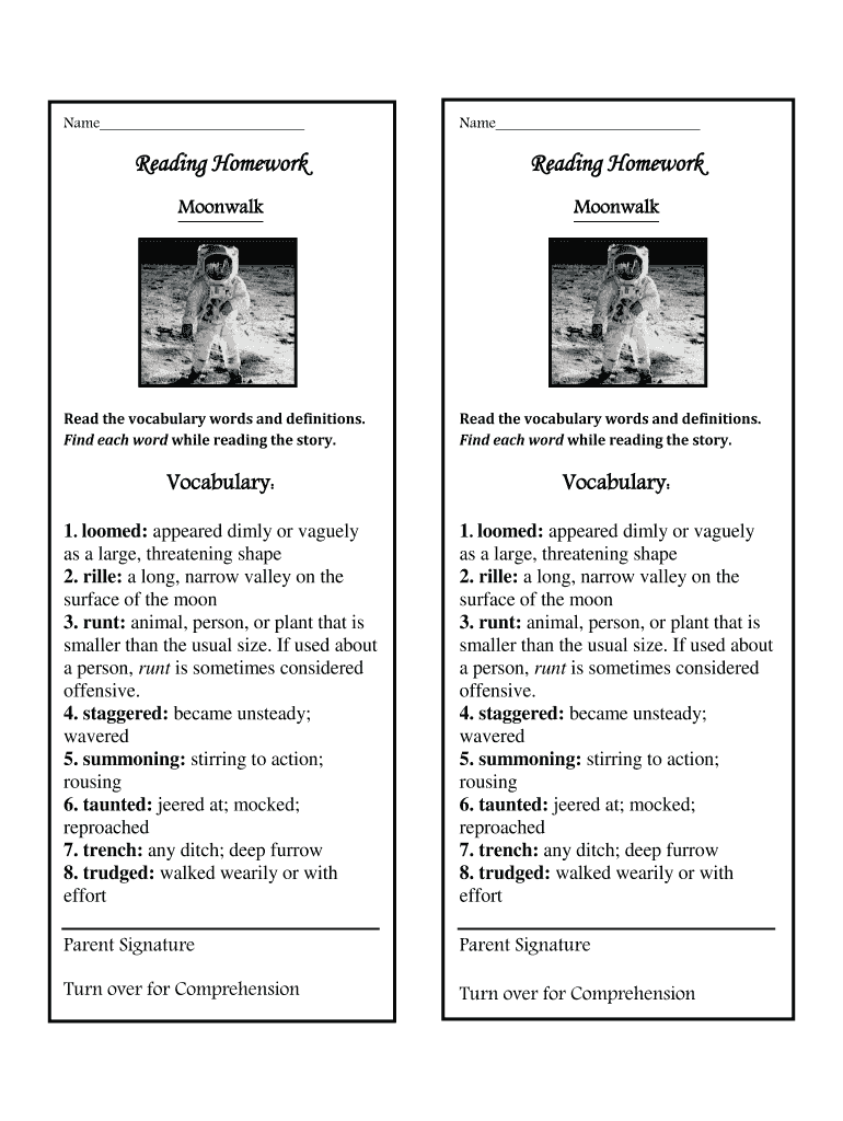 Name Reading Homework Moonwalk Read the vocabulary words and definitions. Find each word while reading the story. Read the vocabulary words and definitions. Find each word while reading the story.