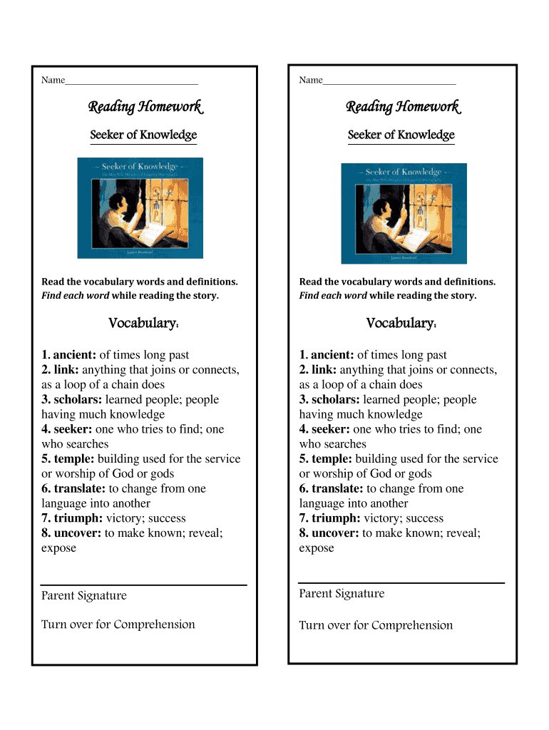 Name Reading Homework Seeker of Knowledge Seeker of Knowledge Read the vocabulary words and definitions. Find each word while reading the story. Read the vocabulary words and definitions. Find each