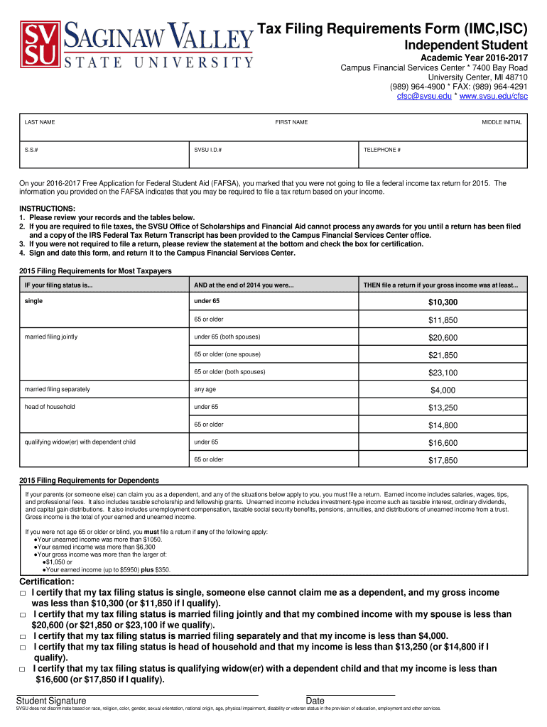 Tax Filing Requirements Form (IMC, ISC) Independent Student Academic Year 20162017 Campus Financial Services Center * 7400 Bay Road University Center, MI 48710 (989) 9644900 * FAX: (989) 9644291 CFC
