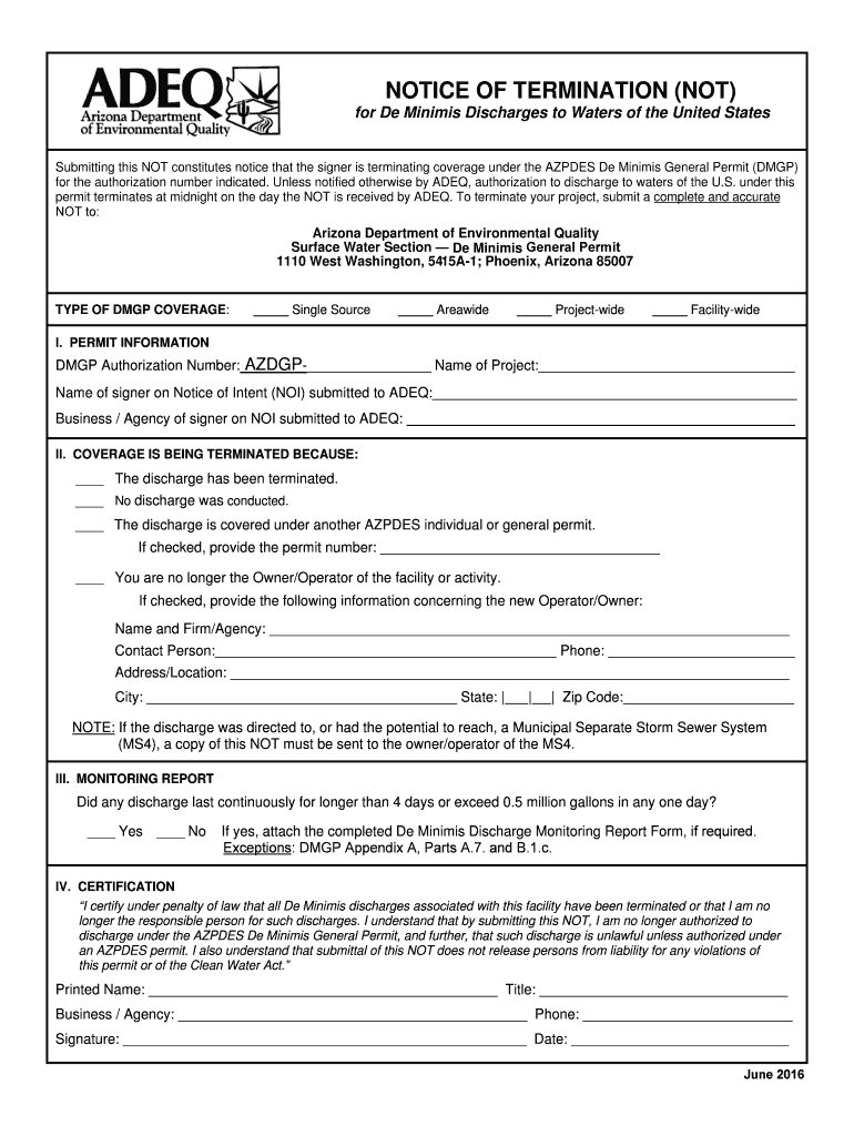 Get the free Notice of Termination - Arizona Department of Environmental ...
