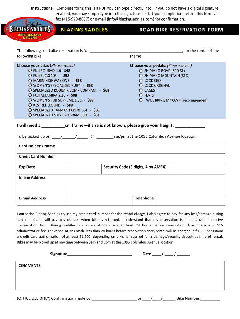BLAZING SADDLES ROAD BIKE RESERVATION FORM The following road bike reservation is for, for the rental of the following bike: (name) Choose your ...